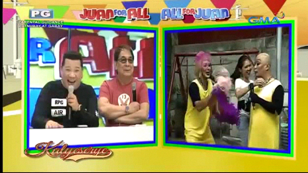 Donya Tidora found it hard to put back Lola Nidora’s wig at the ALDUB 17th Weeksary episode. One of the Rogelio Rogelio Rogelio had to help her. Allan K was surprised at one of the Rogelio’s initiative. “Si Rogelio pala ang hairstylist mo. Lalaki ba talaga yan?” (So Rogelio is your hairstylist. Is he really a guy?) Lola Nidora reasoned that Rogelio that learned through osmosis. “Natuto na rin ito kasi nababarkada kay Barbara Sastre.” (He learned since he became close friends with Barbara Sastre.) Sastre designed YayaDUB’s wedding gowns. The one she wore when she collapsed. And the other one she wore at the ALDUB Against All Odds episode.