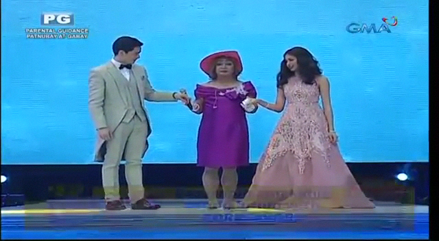 Lola Nidora held both YayaDUB and Alden. She helped them get closer in the middle of the cross-shaped stage. “Mas masarap ang mga bagay na pinaghihirapan natin. Mga bagay na hindi pinipilit. Hinihintay ang tamang pagkakataon. Dumating na hindi inaasahan. Binago ang mga buhay natin. Yaya. Alden Eto na ang tamang panahon.” (The things we work hard for are sweeter. Things that are not forced. Waiting for the right opportunity. Arrived when we least expect them. Changed our lives. Nanny. Alden. This is now the right time.) With ALDUB now officially a couple at the ALDUB EB Tamang Panahon special episode. Lola Nidora left them to be on their own and walked away.