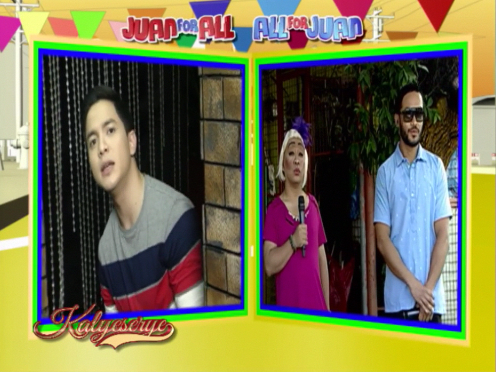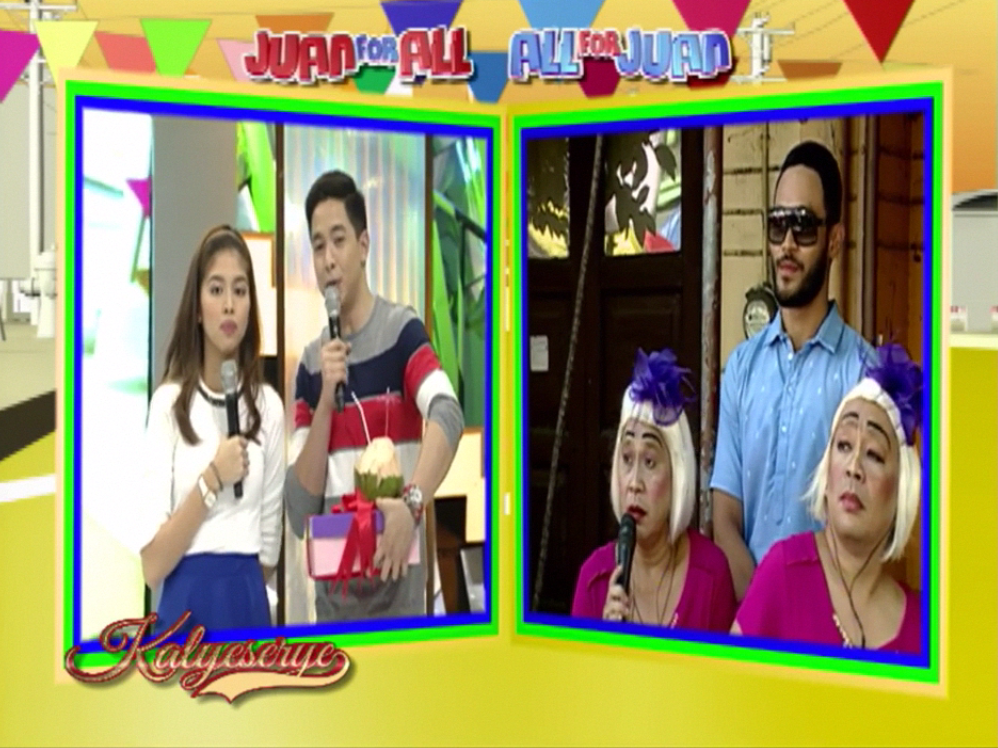 Alden felt more like punk’d than surprised. “Wala pala ha? Halika dito.” (So you’re unavailable, huh? Get here.) Alden pulled Divina by her hand to greet the audience present at the ALDUB 40th Weeksary episode. She made Alden drink her gift. “Ibibigay ko muna sa yo yung dinaanan ko.” (I’d give you first the item that I picked up somewhere.) She handed the juice to Alden and greeted the KalyeSerye commentary panel present. Boss Joey de Leon, Allan K a.k.a. Miss A and Bossing Vic Sotto.