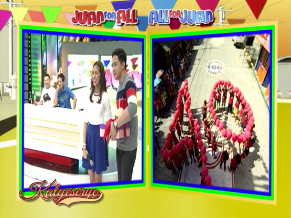Alden agreed. “Sige po, lola.” (Okay, granny.) Donya Tinidora called Rogelia. “Pahiram cellphone mo.” (Let me borrow your cellphone.) Alden tried not to describe his gift too much. “Nandito po gift ko sa kanya eh. Pero may isa pa po akong surprise. Eto po yung pinaghirapan ko.” (Her gift is here with me. But I have another surprise. Here’s what I worked hard for.) The surprise revealed at the ALDUB 40th Weeksary episode was a bunch of balloons that formed the number 40.