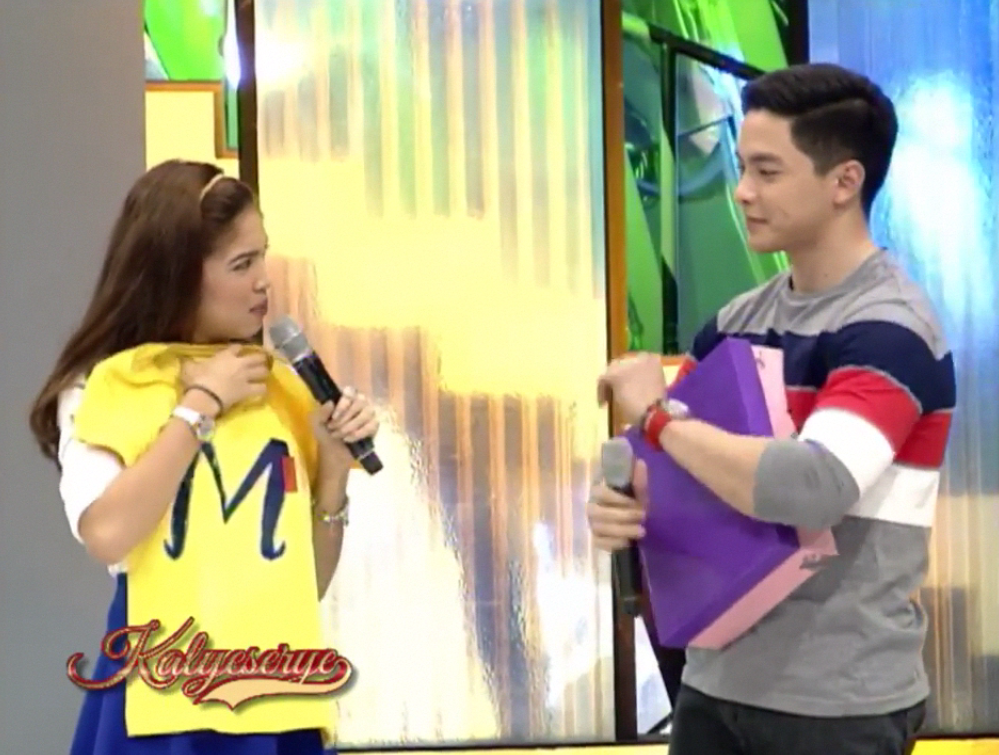 Divina opened the box. “Alden naman. Anong gagawin ko sa confetti?” (Alden, please. What will I do with the confetti?) At the ALDUB 40th Weeksary episode. Alden replied. “Hindi lang confetti yan! Buksan mo kasi.” (It’s not just confetti. Open further.) Divina dug in the confetti and discovered the gift. “Wow! May pa-t-shirt!” Alden commented. “Hindi lang basta t-shirt yan.” (It’s not just a t-shirt.)