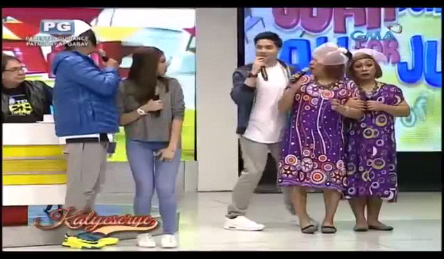 Divina has become skeptical the moment Lola Nidora yelled “Justin Bieber!” “Tatay mo ba yan?” (Is that my father?) The man would stop in between “dance numbers” to wait on the dancer/bodyguards. He then arrived in front of the De Explorer entourage with his own entourage. Donya Tinidora almost choked in laughter as Lola Nidora just looked on with Divina and Alden. Half a minute later and the man’s face was revealed at the ALDUB Ang Pagtatagpo episode. The KalyeSerye commentary panel then howled in laughter.