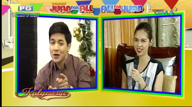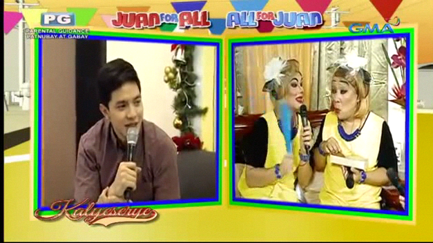 Lola Nidora just commented on YayaDUB’s hobbies. “Iba pala mga hobbies mo. What is your favorite movie?” YayaDUB’s answers were familiar to the KalyeSerye commentary panel. “Mag-Toning Tayo. Horsey Horsey Tigidig Tigidig [and other movies starring Tito, Vic and Joey].” Boss Joey de Leon suggested a movie he starred in a lead role at the ALDUB Deja Vu Love episode. “Ayaw mo ng RoboRats?” (Don’t you like RoboRats?) YayaDUB liked the suggestion. “Puede rin po.” (That will do.)