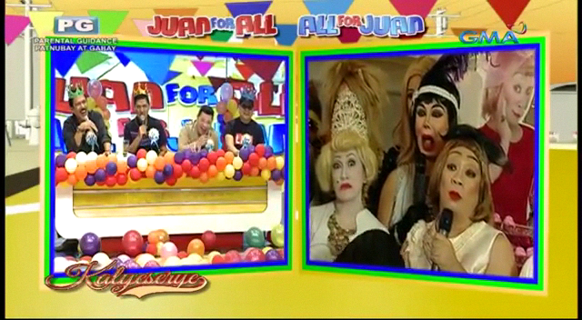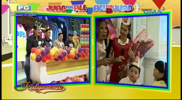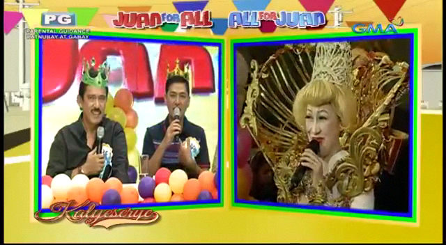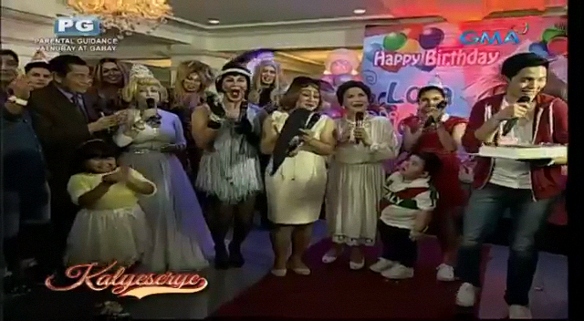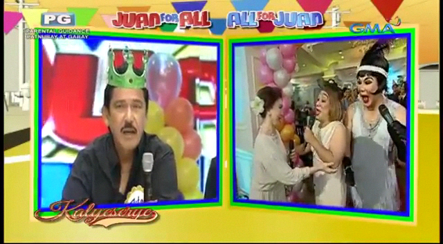 The party at the ALDUB Happy BDay Lola episode reminded the audience of a children’s party. The KalyeSerye commentators at Broadway Centrum was surrounded with balloons. All four of them – Senator Tito, Bossing Vic, Boss Joey and Allan K – wore crowns in solidarity with the occasion. At the venue, Donya Tidora showed Lola Nidora her guests. Lola Nidora recognized them. “Yung mga kalaro natin sa agawang base.” (Our playmates at base games.)