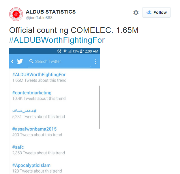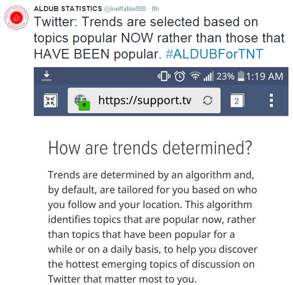 Before the ALDUB KalyeSerye Trend, skeptics have doubted Twitter’s ability to measure trending topics. There are topics that people talk about that trend but don’t translate into ratings. For example, a mass of fanatics go on Twitter and tweet simultaneously about the soap opera they watch at the same time. Surely there is a Twitter party going on. But how about the ratings? (Hello, Mr. AI runner-up? How did your first Filipino soap go? It trended nightly but barely lasted half a year) This is why companies placing ads would rather check the ratings instead of trending topics on social media. It also prompted Twitter itself to define their standards about trending topics.
