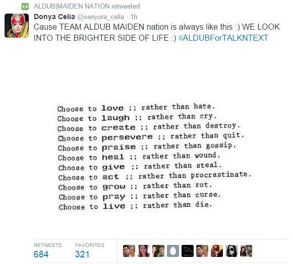 Speaking of Twitter accounts that spurned interesting tweets, shoutouts to the following accounts that you should follow as credited in the Twitter screenshots included. Like Eat Bulaga’s official Facebook page for the ALDUB episode replays. Follow @EatBulaga on Twitter too. It’s the quickest way to join the ALDUB KalyeSerye Trend party. Don’t forget today’s hashtag #ALDUBForTalkNText.