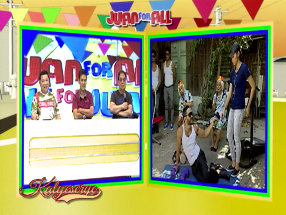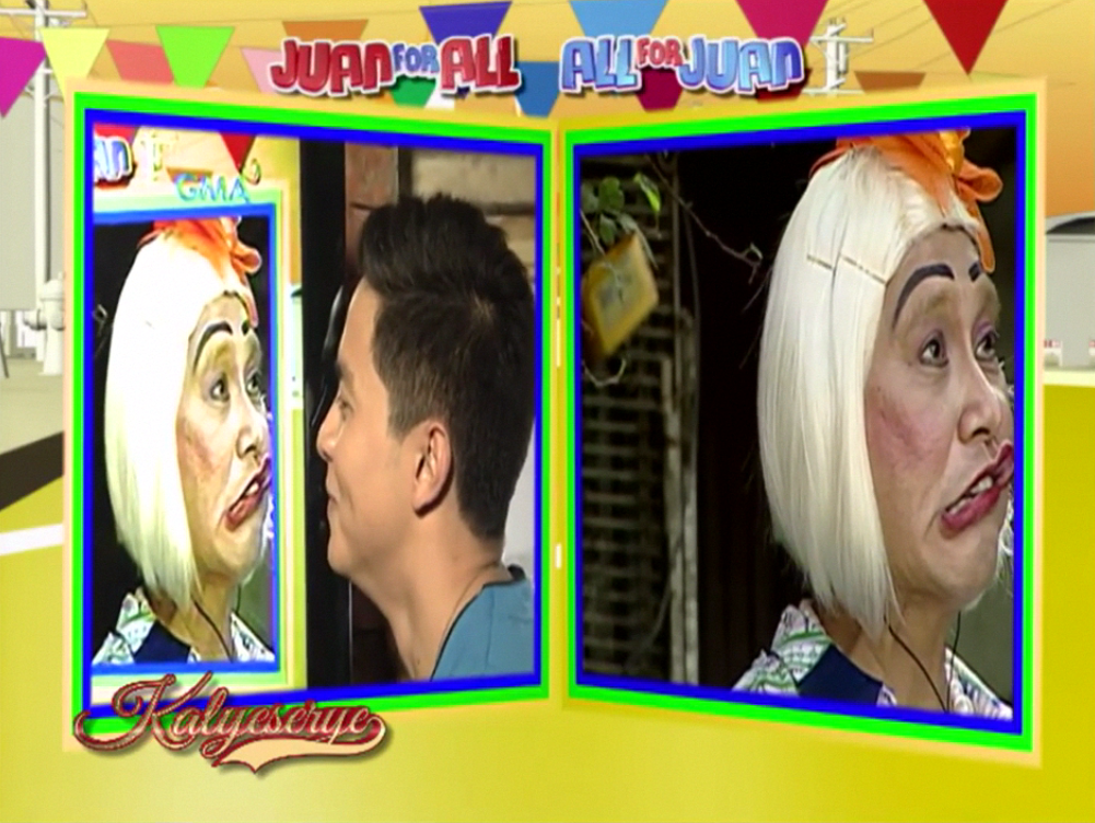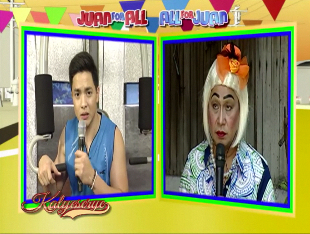 Donya Tinidora pointed out Rogelia. “Ayan oh. Tingnan mo. Sirenang-sirena.” (There. Look at him. Looks so much like a mermaid.) Allan K was amused. “Nakabilad ng tanghaling tapat.” (Tanning on high noon.) Donya Tinidora could only be just as amused with Rogelia’s efforts at the ALDUB Love on Cue episode. “Sasali talaga ng Ms Universe. Tanghaling tapat. Nagpapaganda ng katawan.” (He really plans to join the Miss Universe. At high noon. And he’s improving his physique.)
