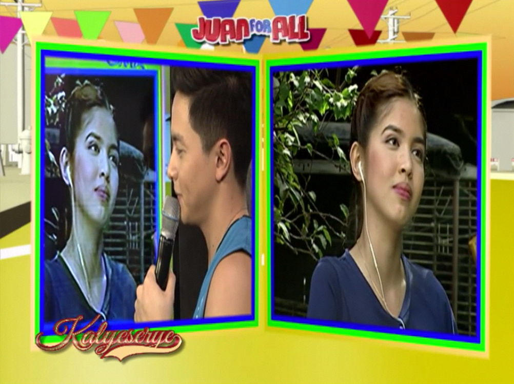 Boss Joey then explained himself. “Tungkol sa bilihan ng mangga eh.” (It’s about a mango store.) Lola Nidora got the drift. “Maliliit na mangga.” (About little mangoes.) At the ALDUB Love on Cue. Divina admitted her worries. “Lola, nakaka-pressure naman po yung kissing scene.” (I feel pressured about the kissing scene.) Allan K then suggested. “Puede rehearse ngayon?” (May we rehearse now?)