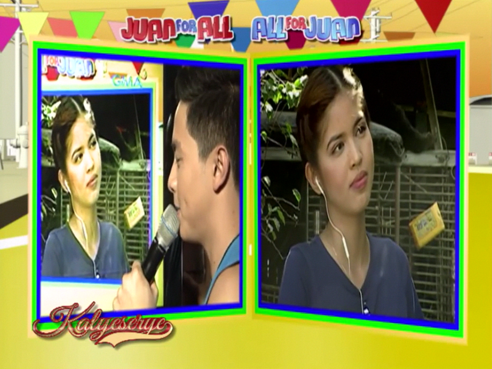 Divina halfway scratched her head. “Lola, turuan nyo po ako. Di po kasi ako sanay kasi.” (Granny, teach me. I’m not used to it.) At the ALDUB Love on Cue episode. Donya Tinidora kept on chastising Divina. “Basta kung hahalik ka, wag mong igaganun yung nguso mo.” (If you’re going to kiss, don’t pucker your lips that way.) Boss Joey saw something wrong too. “Nakadilat pati.” (Her eyes were open too.)
