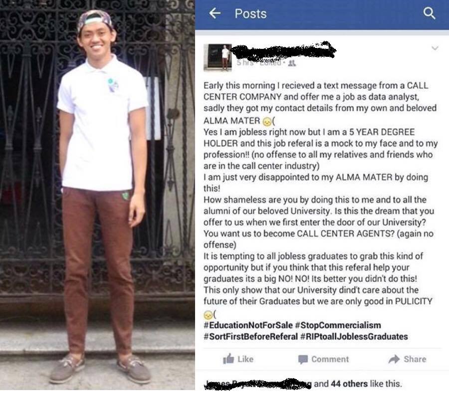 Because according to AuxBreak.com, the call center job refusal involved that of being a data analyst. It does not always mean a call center job i.e. Taking calls on the floor. The misconception about data is it’s all about zeroes and codes. It is not all about zeroes and codes encrypted on the computer. It meant analyzing data to help business cut costs, plan budgets or as AuxBreak.com said “make better business decisions”. It sounds a little like an auditing job. If this kid is already insulted with a data analyst job offer, what more if the job offered is that of a Customer Care Associate? He might have posted worse stuff on his Facebook page. Possibly more vitriolic stuff after a call center job refusal.