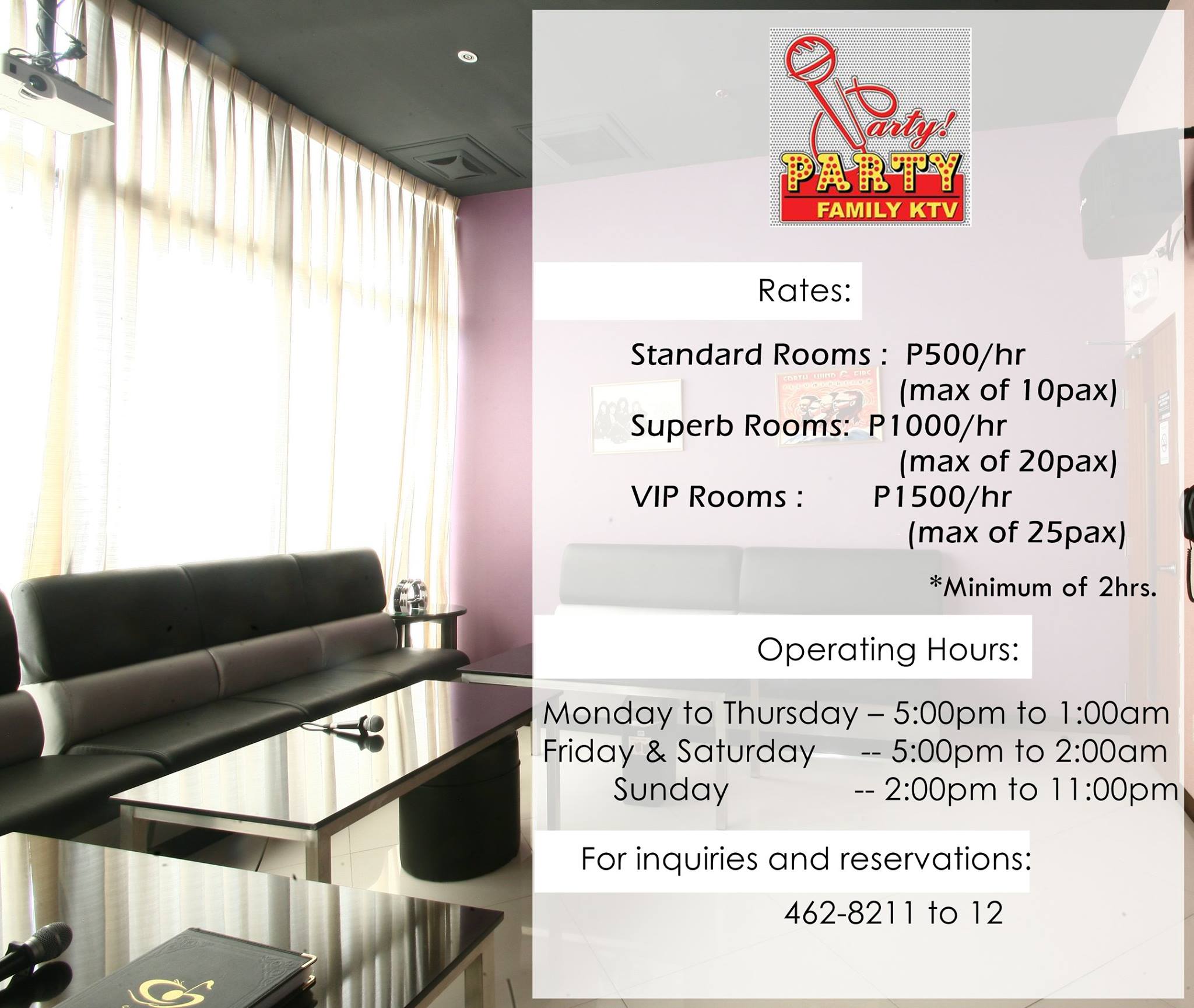 Family KTV in Manila is best enjoyed in a spacious place with a screen big enough to occupy more than half of the wall. That’s the kind of big time entertainment found here at Party Party Family KTV located in Pasig City. Their largest KTV pods are the VIP Rooms. Each room can fit in as many as 25 people. You can only imagine the number of family members – both intimate and extended – can come over to join your karaoke party. Rates for for P1,500 for a minimum of 2 hours. Inquiries and reservations are best placed by calling them up. Dial 462-8211 to 12 for more details.