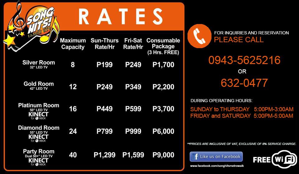 A nightlife joint found by Metrowalk in Pasig City. Song Hits Family KTV’s non-consumable rates between Sunday and Thursday go for P1,299 per hour. And the non-consumable rates for Friday and Saturday are pegged at P1599 per hour. Inquiries may be rung in through their landline number, 632-0477. You can also reach them at their mobile number at 0943-5625216.