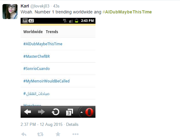 The hashtag #HopiaPaMore almost trended. If not for the #AlDubMaybeThisTime episode’s main hasthag #AlDubMaybeThisTime. As of 2:38pm Philippine time, it was trending worldwide at 728K tweets. It was a long stretch from the next trending topic. You can easily imagine teens and yuppies complaining about the internet freezing or slowing down. This much anticipation and … and … another “could have been”.