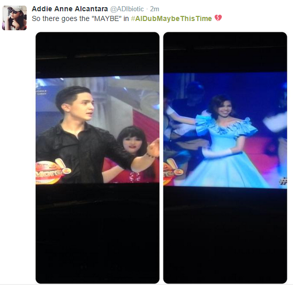 Everybody’s brains are conflicted in the #AlDubMaybeThisTime episode. They know that they MIGHT not meet because it’s Wednesday. But they wanted the couple badly to meet NOW. They can’t wait for Saturday anymore! And most special episodes occur on a Saturday. When did you see a couple not meet and get everyone else to root for them to meet finally? Everyone is in the moment and then YayaDUB ran away to avoid some curse.